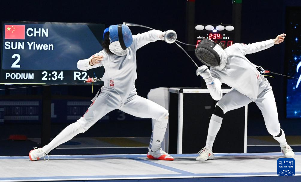 6月22日,中国选手孙一文(左)与队友余思涵在女子个人重剑比赛中。新华社发(阿萨德摄)
