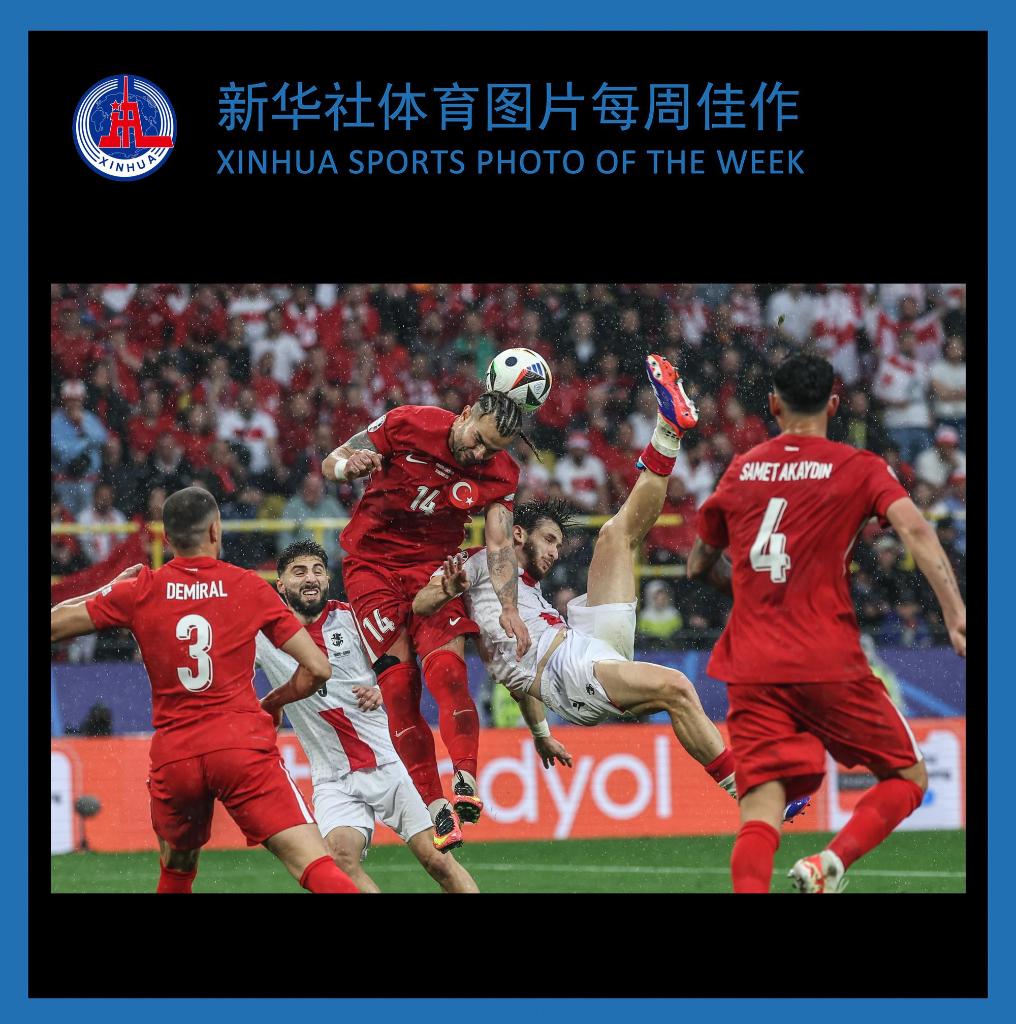6月18日,土耳其队球员阿卜杜勒克里姆·巴尔达克奇(中)在比赛中与格鲁吉亚队球员克瓦拉茨赫利亚(右二)争抢。新华社记者 潘昱龙 摄