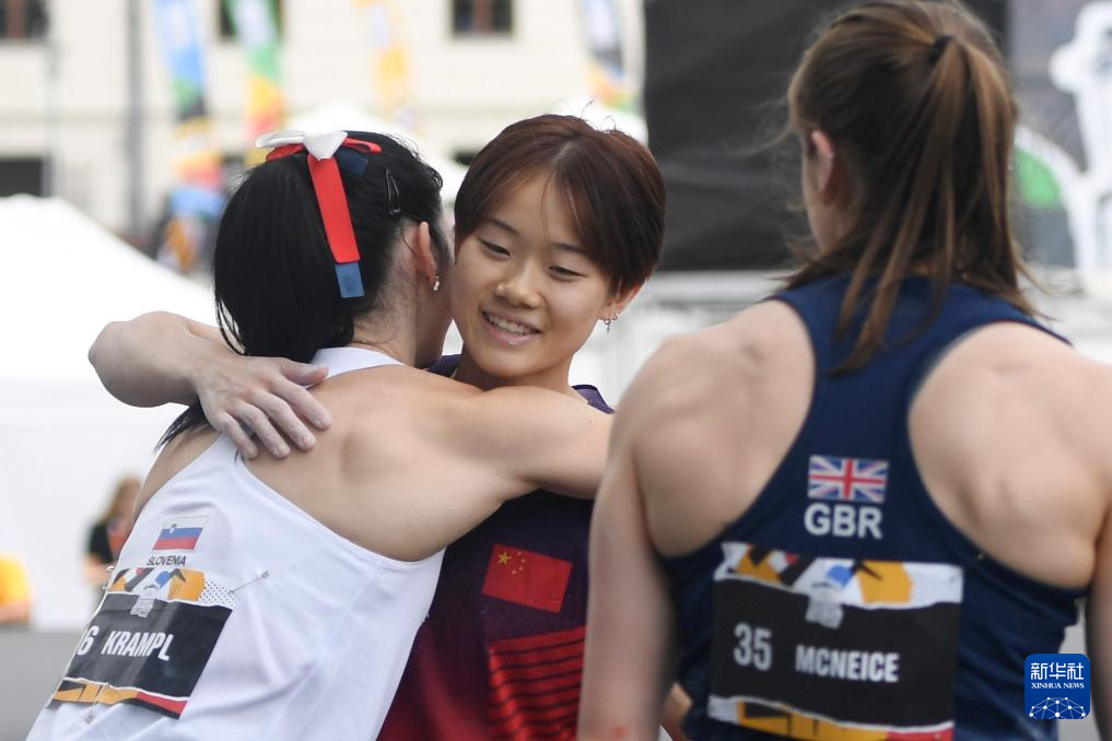 6月23日,中国选手骆知鹭(中)在难度赛后与斯洛文尼亚选手克兰普尔拥抱。新华社记者 贺灿铃 摄
