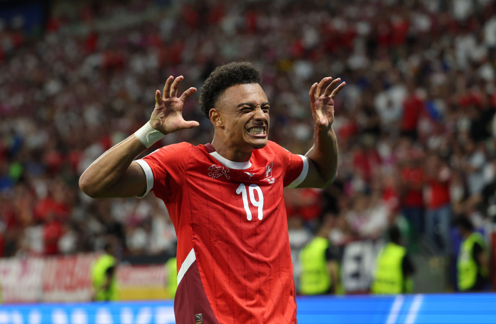 6月23日,瑞士队球员恩多耶庆祝进球。新华社记者 白雪飞 摄