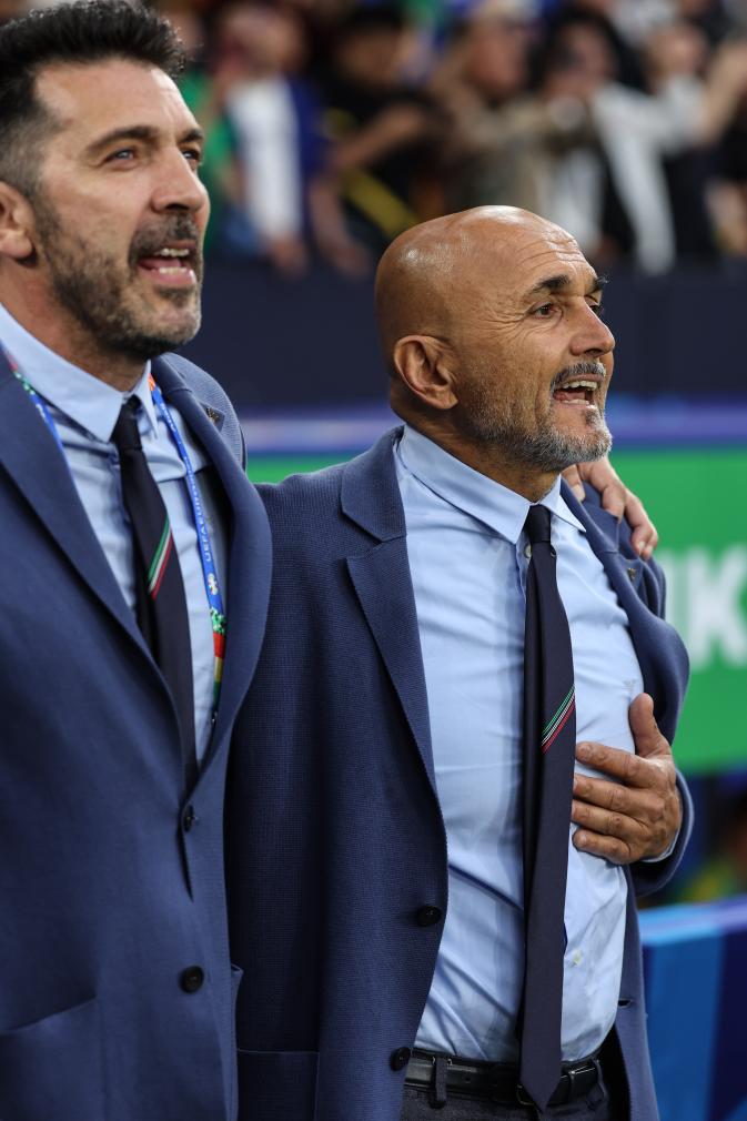 6月20日,意大利队主教练斯帕莱蒂(右)在比赛前唱国歌。新华社记者 潘昱龙 摄