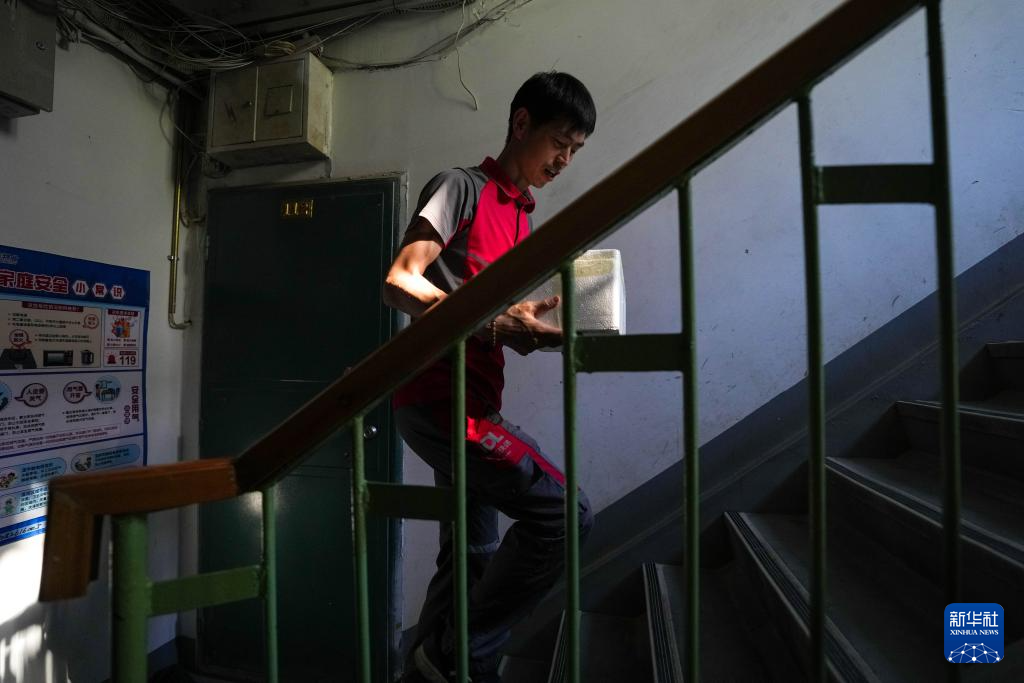 6月24日,栾玉帅在北京市海淀区一小区派送快递。新华社记者 鞠焕宗 摄