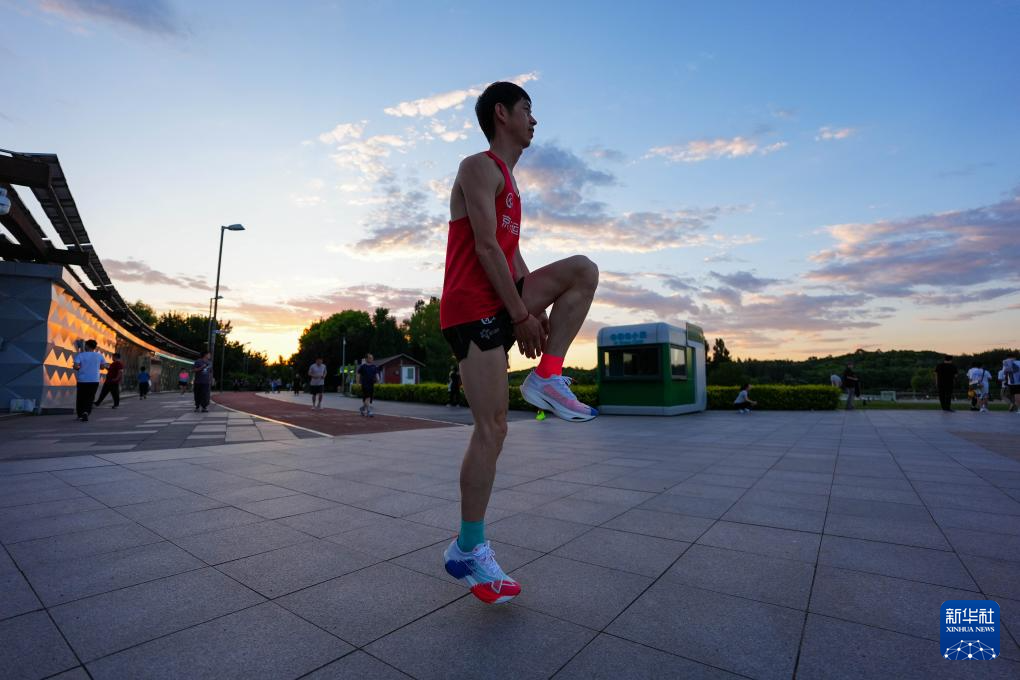 6月24日,栾玉帅在北京奥林匹克森林公园进行跑前热身。新华社记者 鞠焕宗 摄