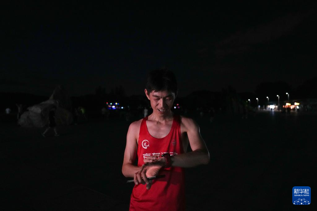 6月24日,在北京奥林匹克森林公园,栾玉帅在跑步训练后查看运动数据。新华社记者 鞠焕宗 摄