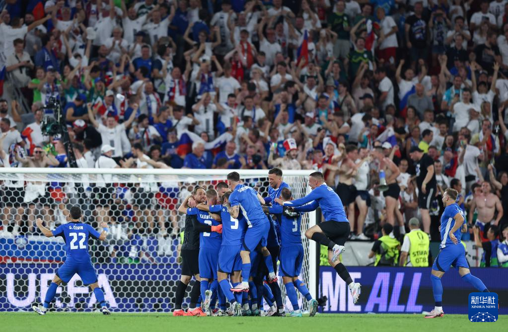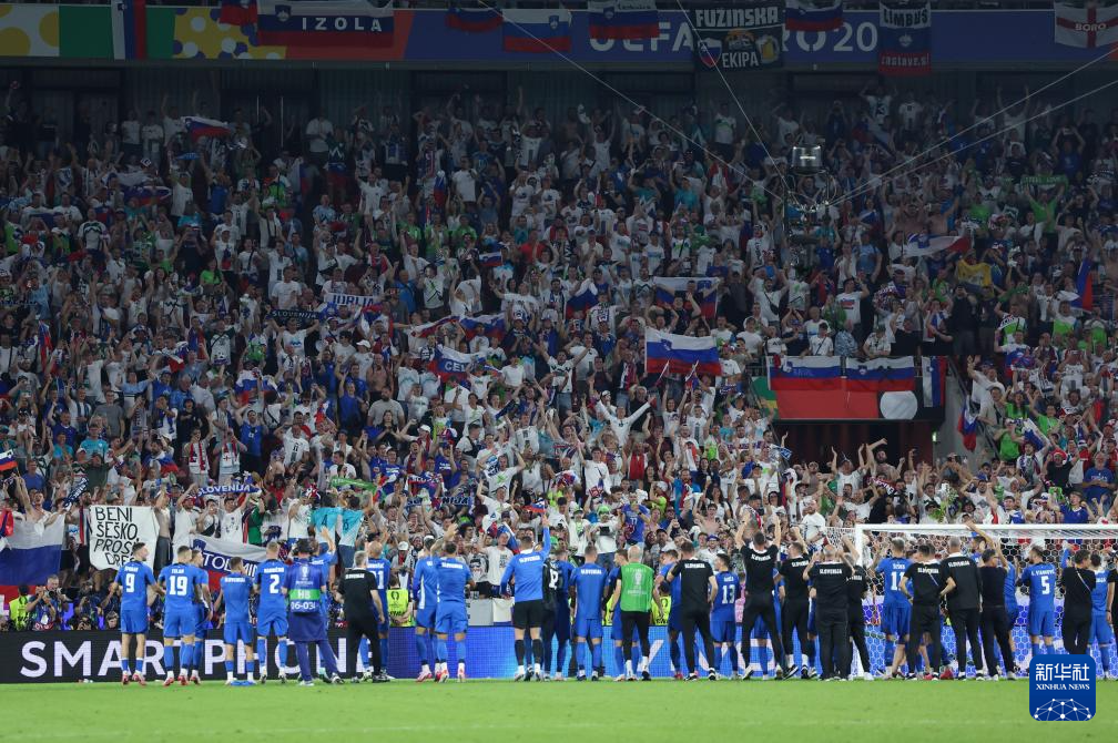 6月25日,斯洛文尼亚队球员在比赛后庆祝。新华社记者 白雪飞 摄