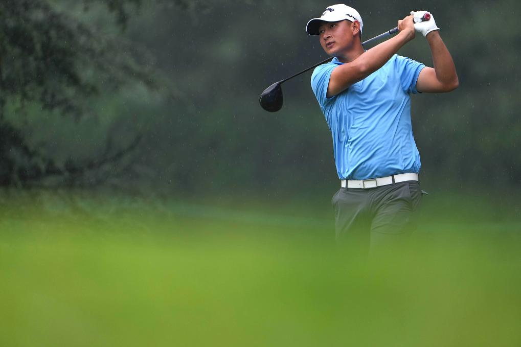图为2017年9月2日,第十三届全运会高尔夫球项目男子团体第一轮比赛,北京队选手窦泽成在比赛中挥杆。新华社记者 张誉东 摄