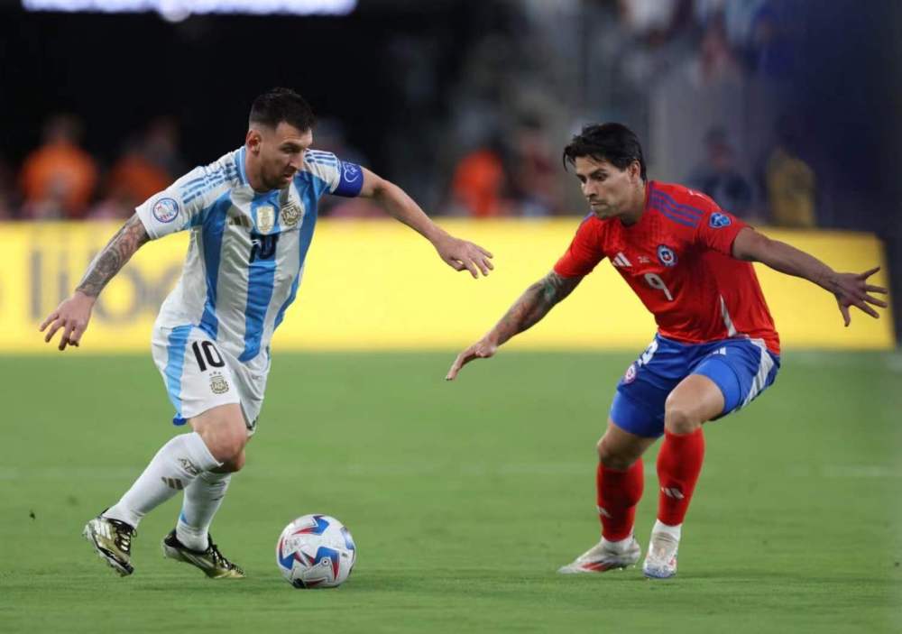 6月25日,阿根廷队球员利昂内尔·梅西(左)在比赛中突破。图片来自南美洲足球联合会官网