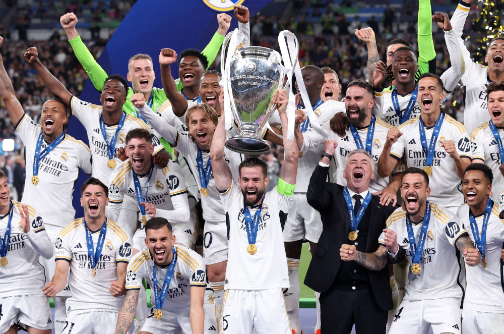 2024年6月1日,皇家马德里队在颁奖仪式上庆祝球队在2023-2024赛季欧洲足球冠军联赛中夺冠。新华社发