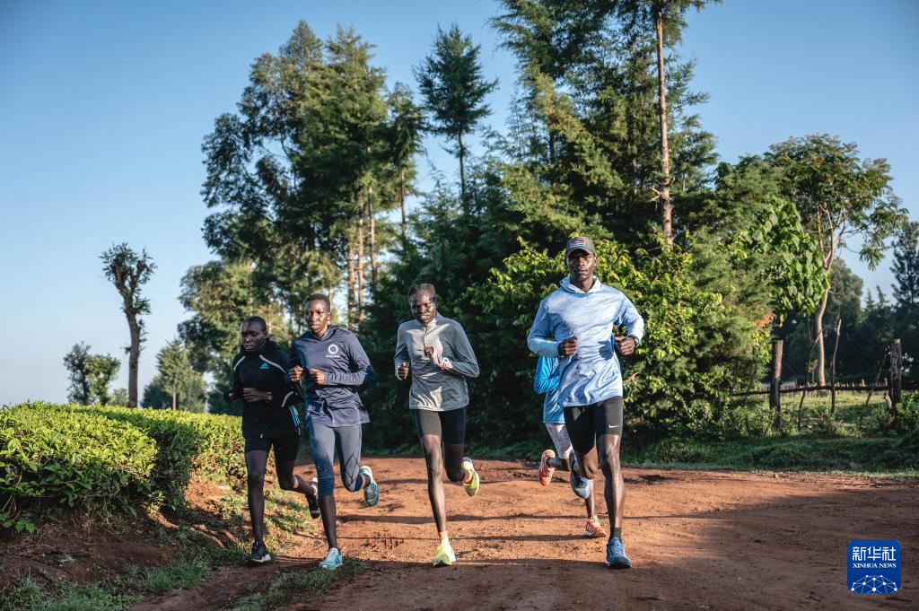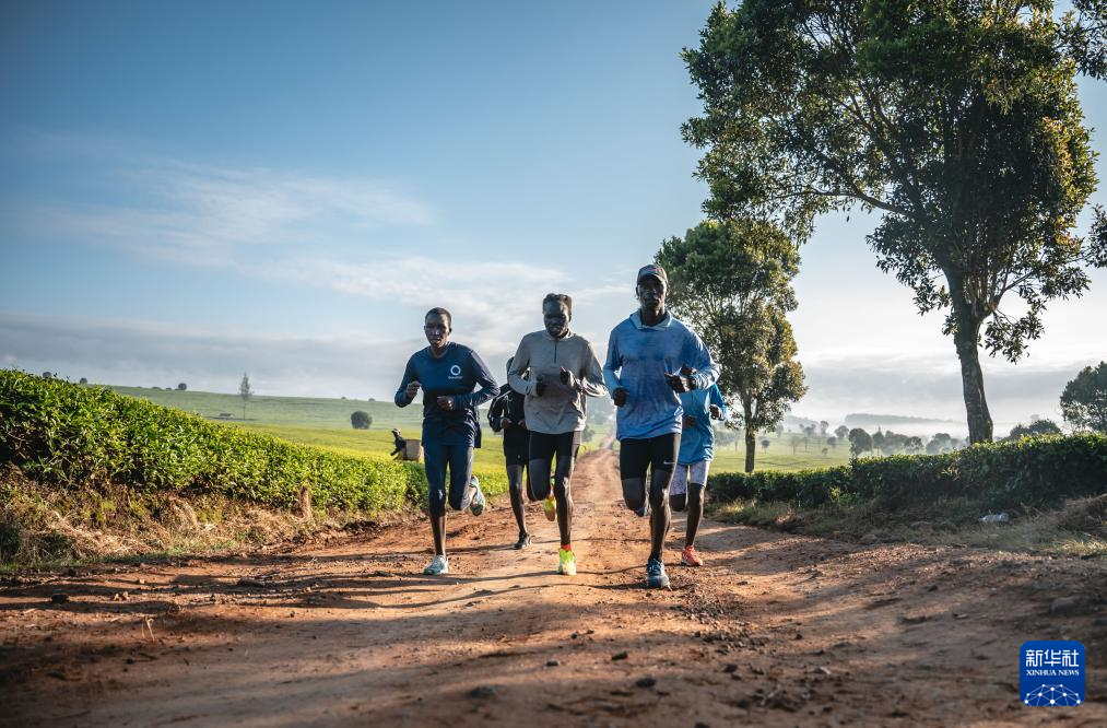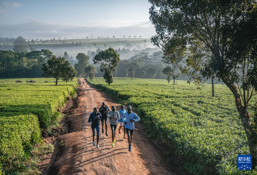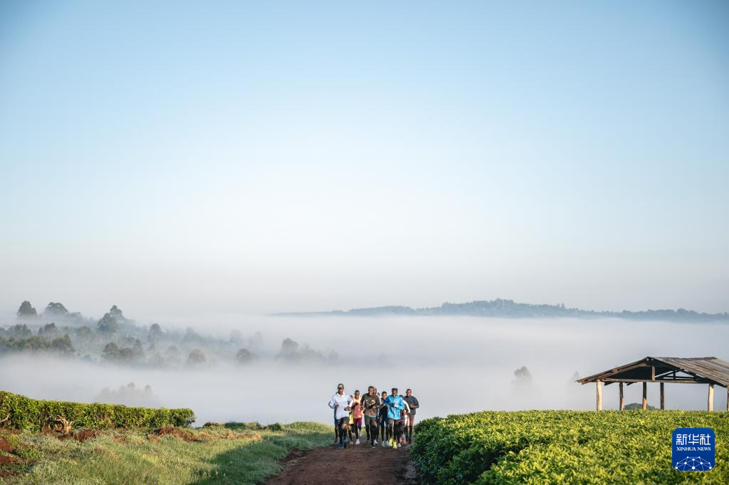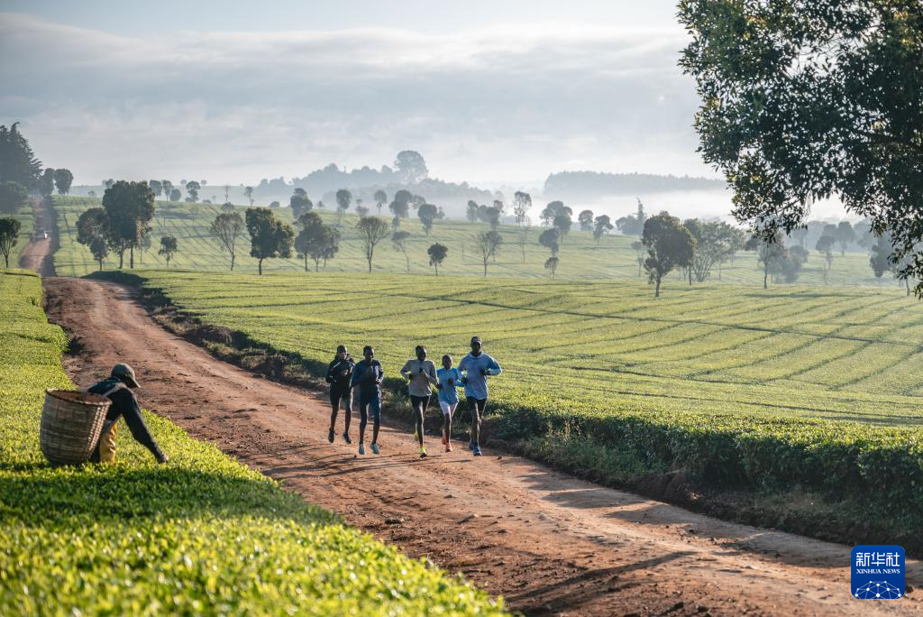 在肯尼亚西部南迪郡,佩里娜与队友在高原茶地间训练(6月22日摄)。新华社记者 王冠森 摄