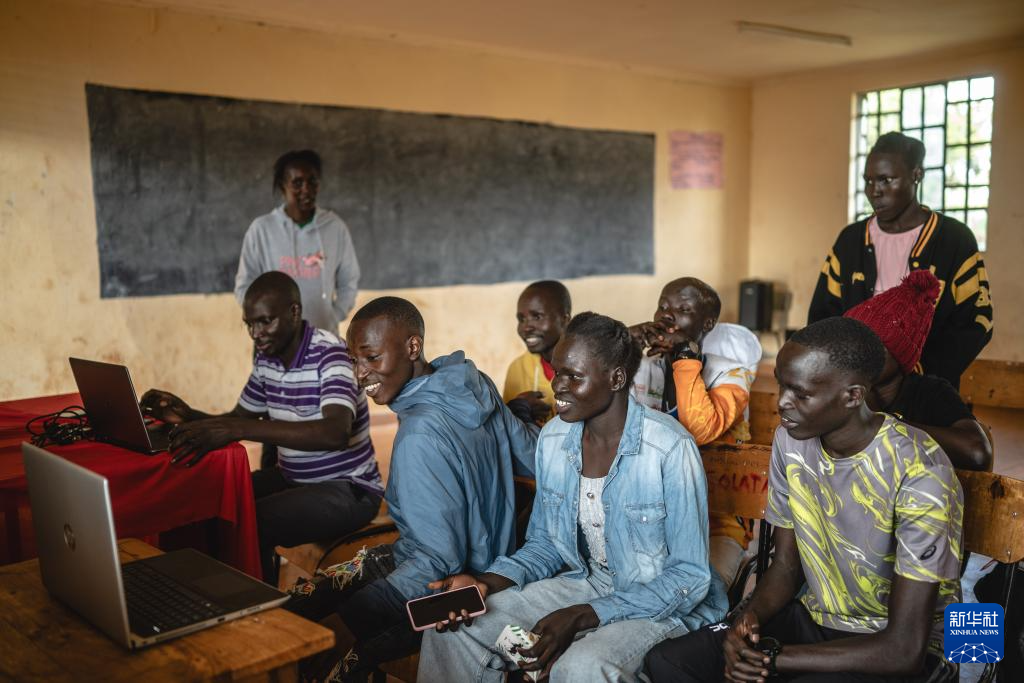 在肯尼亚西部南迪郡,佩里娜(前中)与队友一起在学校上网课(6月22日摄)。新华社记者 王冠森 摄