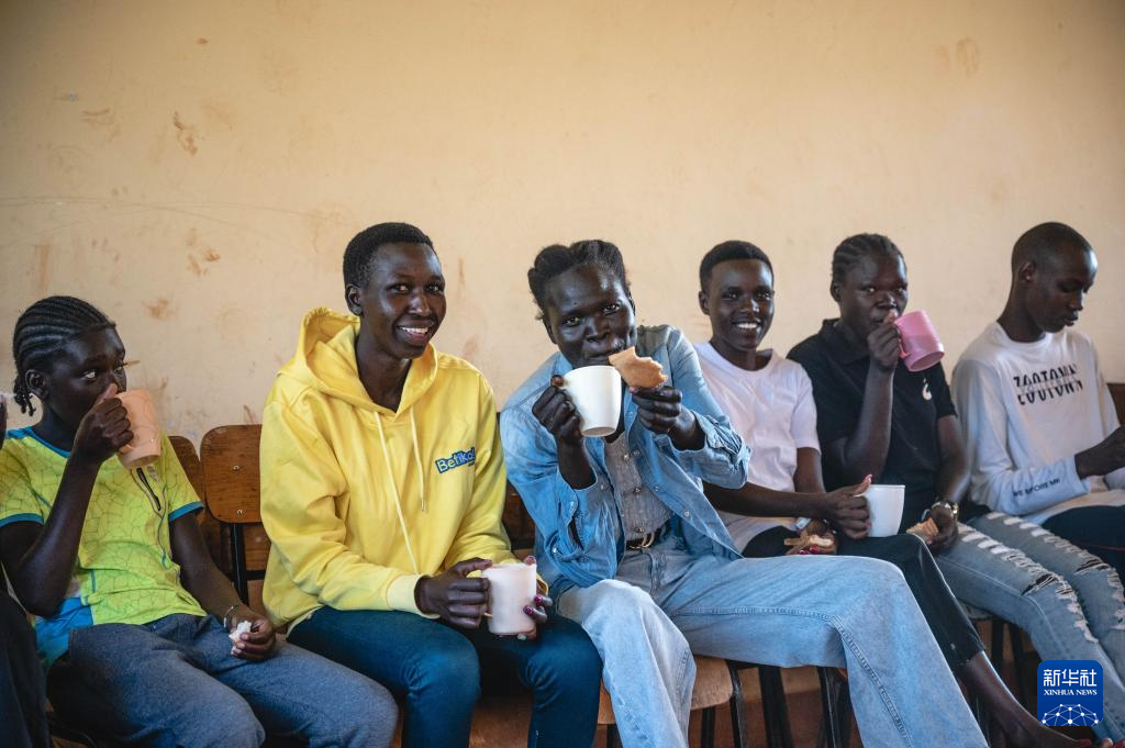 在肯尼亚西部南迪郡,佩里娜(左三)在训练后吃早餐(6月22日摄)。新华社记者 王冠森 摄