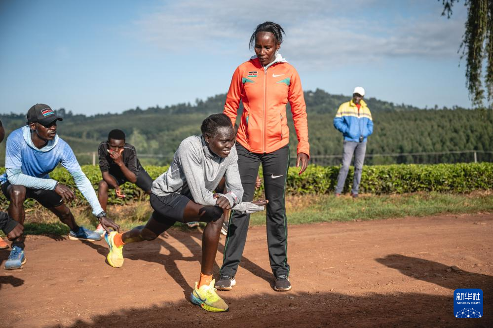 在肯尼亚西部南迪郡,教练杰普科斯盖(前右)在晨练后帮助佩里娜(前中)拉伸放松(6月22日摄)。新华社记者 王冠森 摄