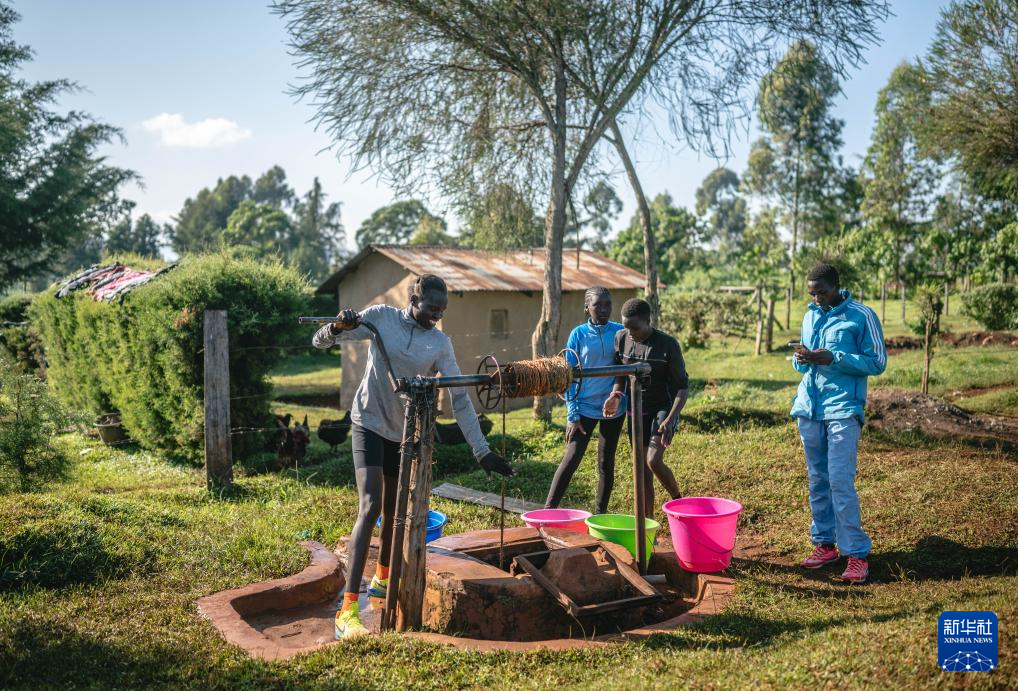 在肯尼亚西部南迪郡,佩里娜(前左)在学校内打水(6月22日摄)。新华社记者 王冠森 摄
