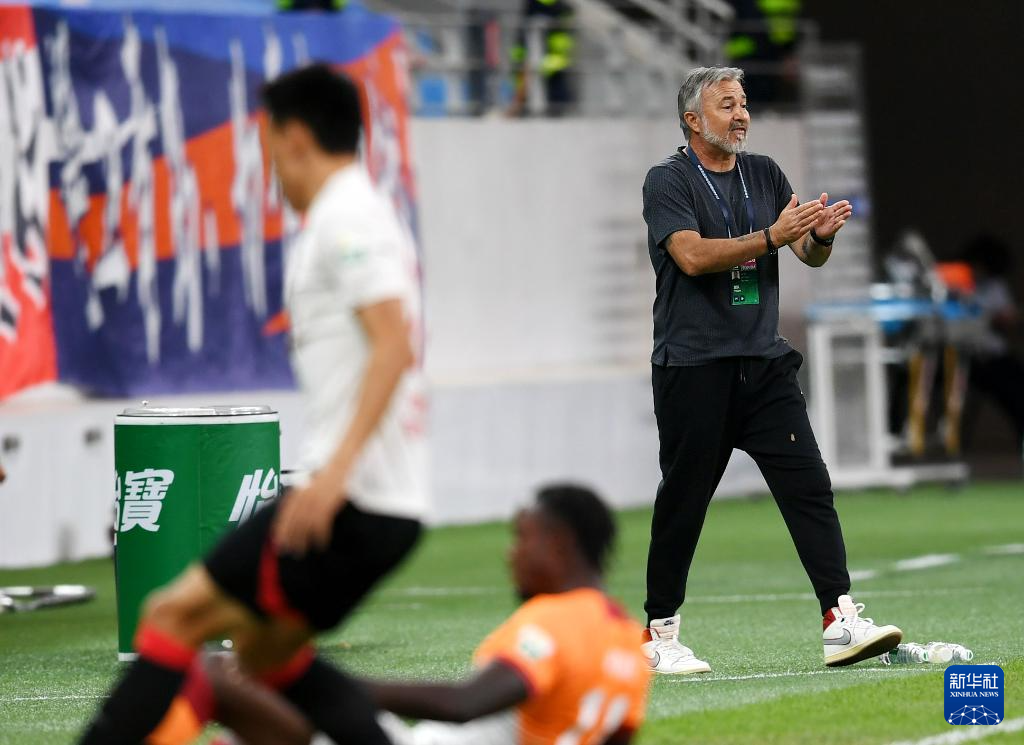 6月26日,青岛海牛队主教练亚森在比赛中鼓励球员。新华社记者 李紫恒 摄