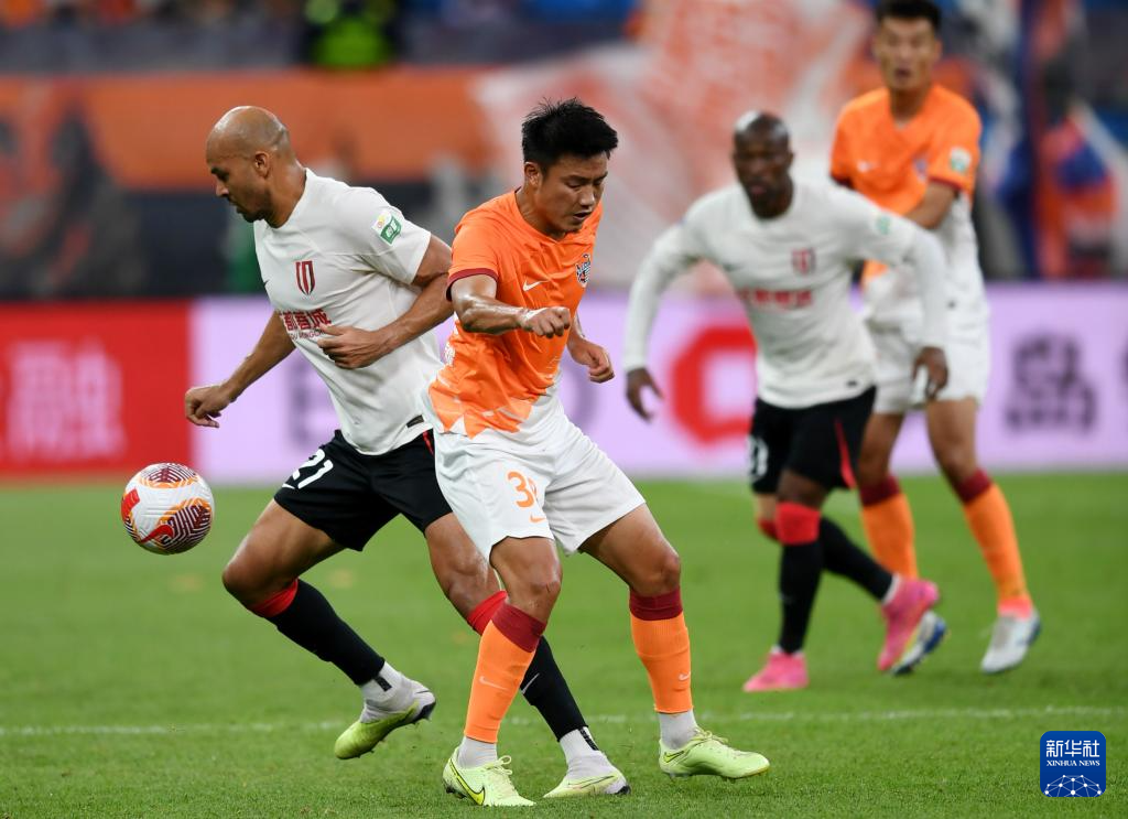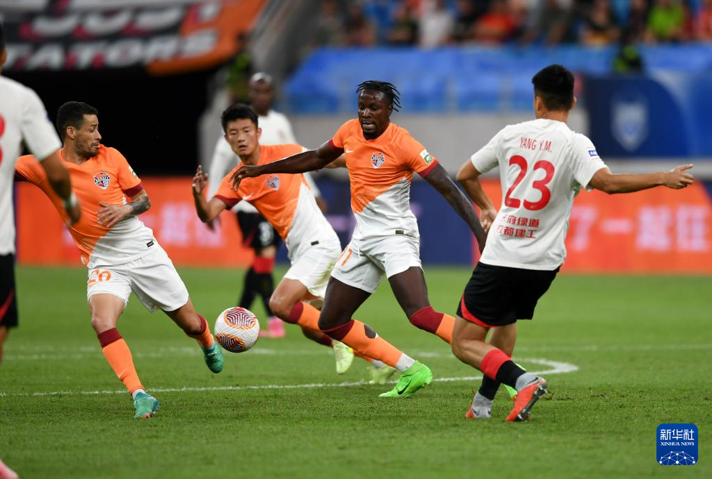 6月26日,成都蓉城队球员古尔芬克尔(右二)与青岛海牛队球员王建明(左二)拼抢。新华社记者 李紫恒 摄