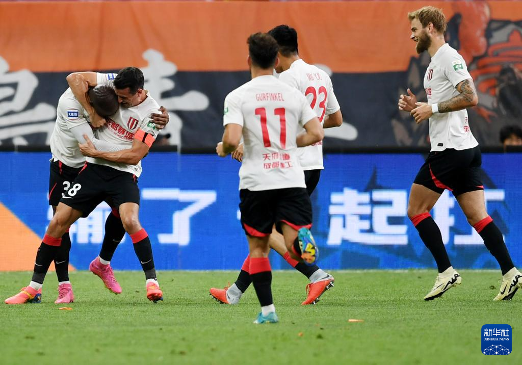 6月26日,成都蓉城队球员在比赛中庆祝进球。新华社记者 李紫恒 摄