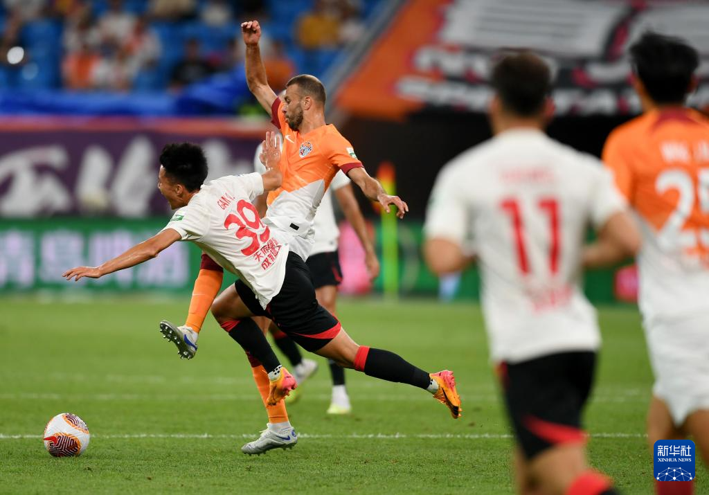 6月26日,成都蓉城队球员甘超(左)与青岛海牛队球员萨里奇拼抢。新华社记者 李紫恒 摄
