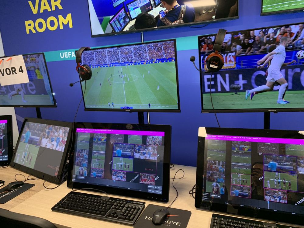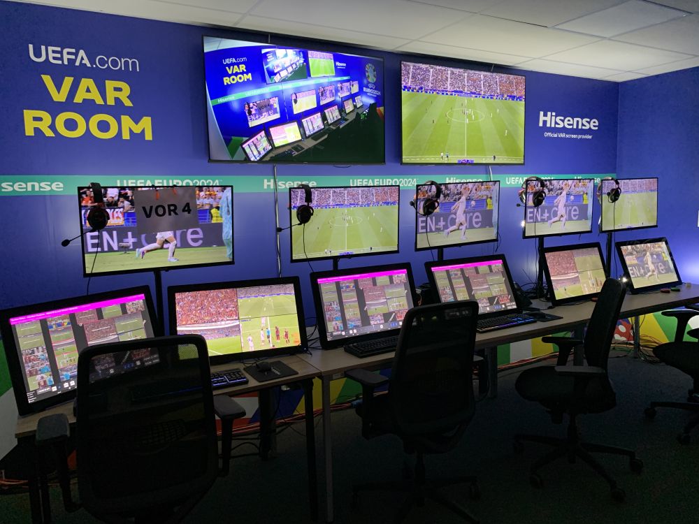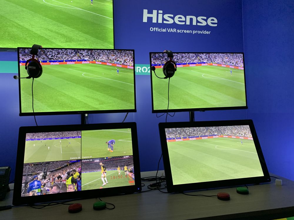 值得一提的是,VAR工作间显示屏上方的墙面上,印有中国企业海信的名字。据了解,海信是本届欧锦赛VAR显示官方合作伙伴,在赛事期间为VAR裁判总部提供显示技术支持,助力裁判做出更精准的判断。这是欧足联首次开放VAR显示独家权益,意味着中国显示技术得到其认可。