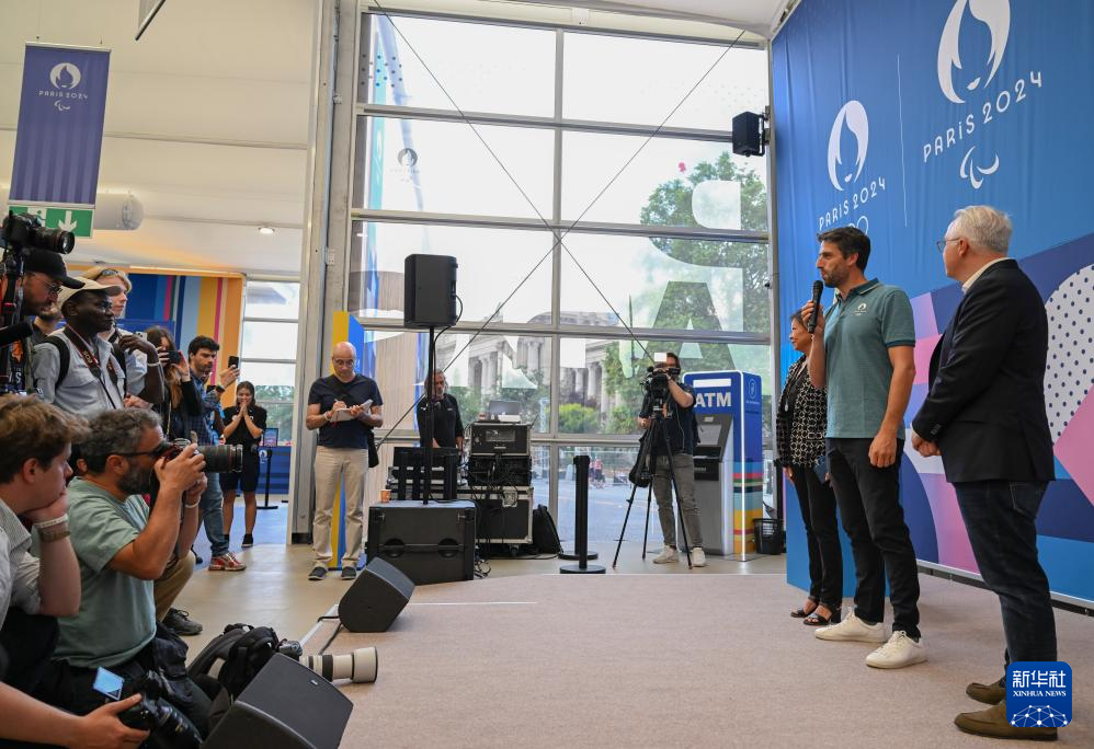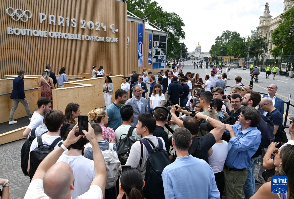 6月27日,巴黎奥组委主席托尼·埃斯坦盖(右二)在巴黎奥运会官方特许商品旗舰店接受采访。新华社记者 贺长山 摄