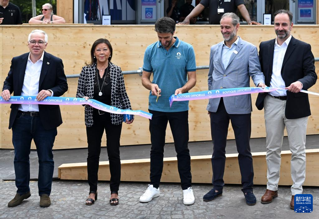 6月27日,巴黎奥组委主席托尼·埃斯坦盖(中)为巴黎奥运会官方特许商品旗舰店剪彩。新华社记者 贺长山 摄