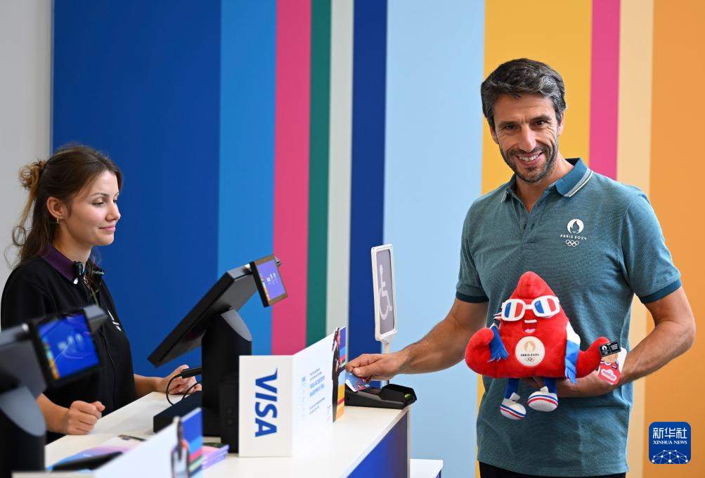 6月27日,巴黎奥组委主席托尼·埃斯坦盖(右)在巴黎奥运会官方特许商品旗舰店购买巴黎奥运会吉祥物“弗里热”周边纪念品。新华社记者 贺长山 摄