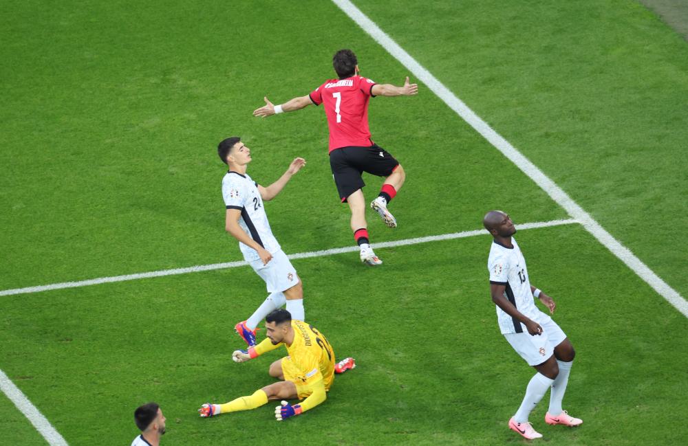 6月26日,格鲁吉亚队球员克瓦拉茨赫利亚(上)庆祝进球。当日,在德国盖尔森基兴进行的2024欧洲足球锦标赛F组第三轮比赛中,葡萄牙队0比2不敌格鲁吉亚队。新华社记者 白雪飞 摄