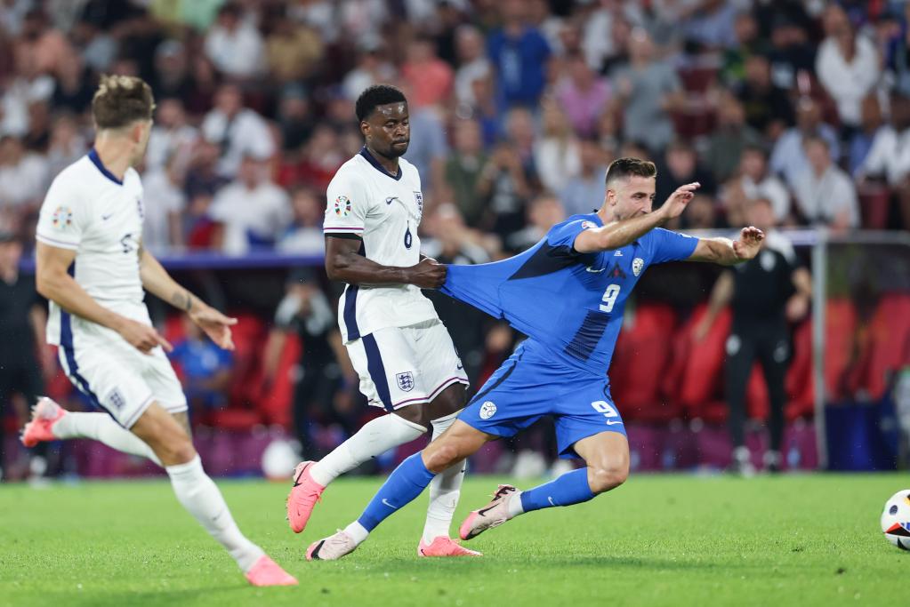 6月25日,英格兰队球员格希(中)在比赛中犯规。当日,在德国科隆进行的2024欧洲足球锦标赛C组第三轮比赛中,英格兰队0比0战平斯洛文尼亚队。新华社记者 白雪飞 摄