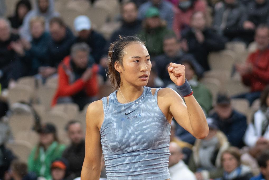 6月1日,郑钦文在2024法国网球公开赛女子单打第三轮比赛中庆祝得分。新华社记者 孟鼎博 摄