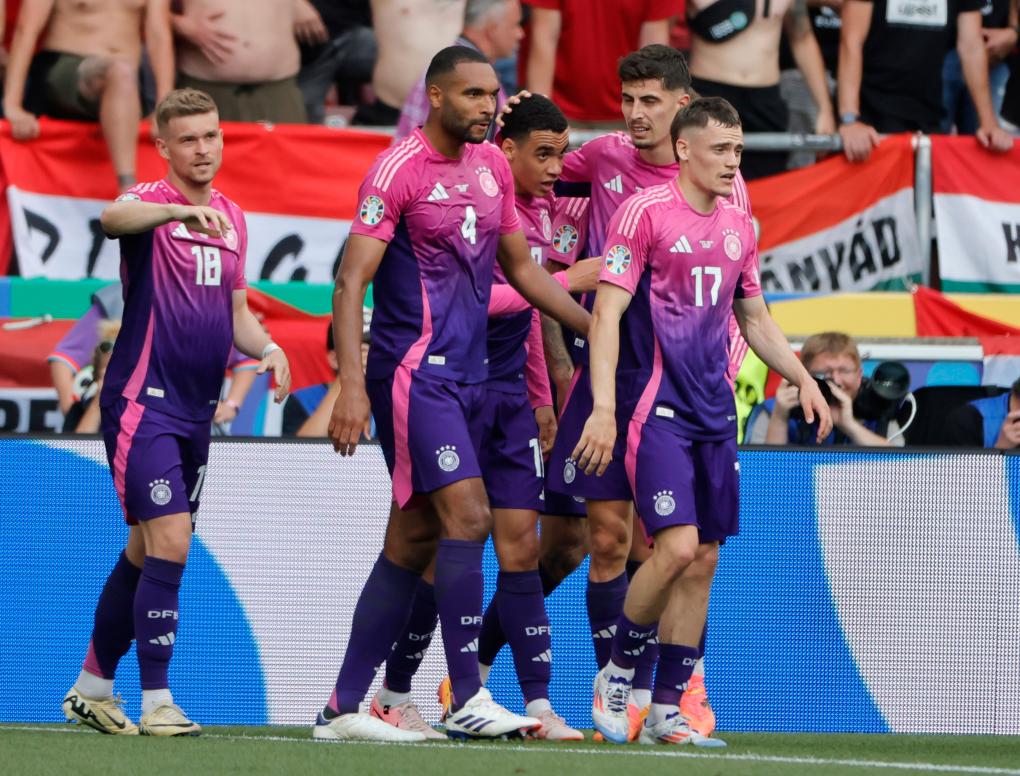 6月19日,欧锦赛小组赛A组第二轮比赛,德国队球员穆夏拉(中)进球后与队友庆祝。新华社发(菲利普·鲁伊兹 摄)