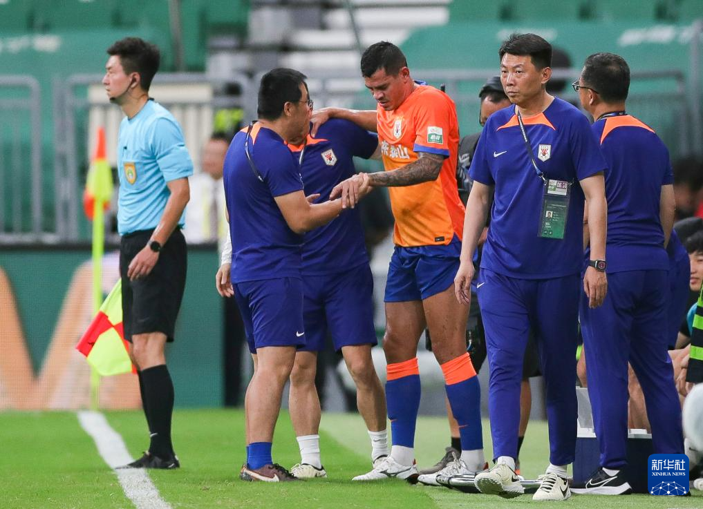 6月30日,山东泰山队球员贾德松(中)在比赛中受伤下场。新华社记者 胡星宇 摄