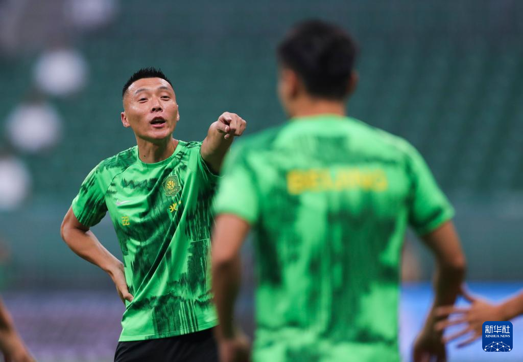 6月30日,北京国安队球员于大宝(左)在比赛前热身。新华社记者 胡星宇 摄