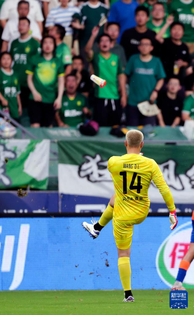 6月30日,山东泰山队守门员王大雷(下)将球迷扔进场内的水杯踢走。新华社记者 胡星宇 摄