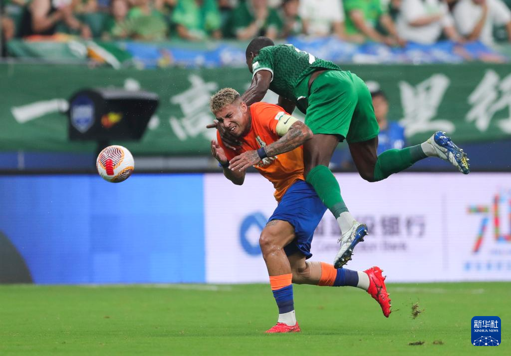 6月30日,北京国安队球员马马杜(右)与山东泰山队球员克雷桑争顶。新华社记者 胡星宇 摄