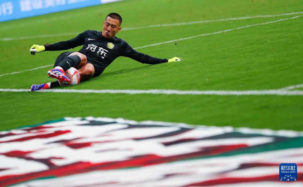 6月30日,北京国安队守门员韩佳奇在比赛中完成救球。新华社记者 胡星宇 摄
