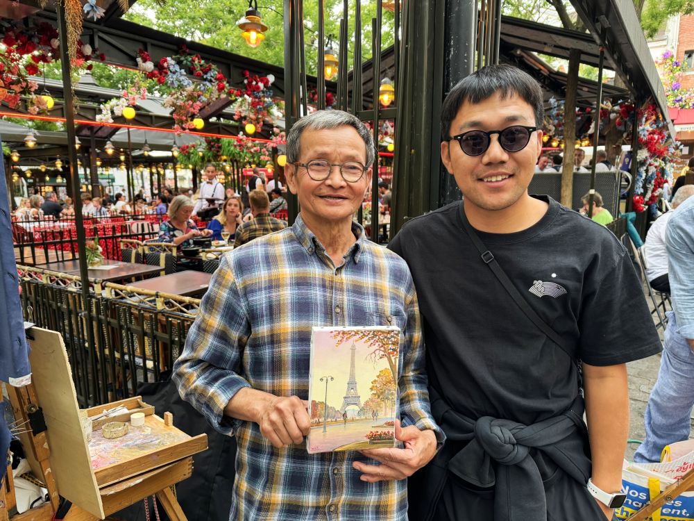 想起如今埃菲尔铁塔已经悬挂上了巨幅奥运五环标志,我们突发奇想,问画家能不能把五环加在铁塔上。这位画家直接拒绝,表示不愿意在原有画作上增加额外的工作量。