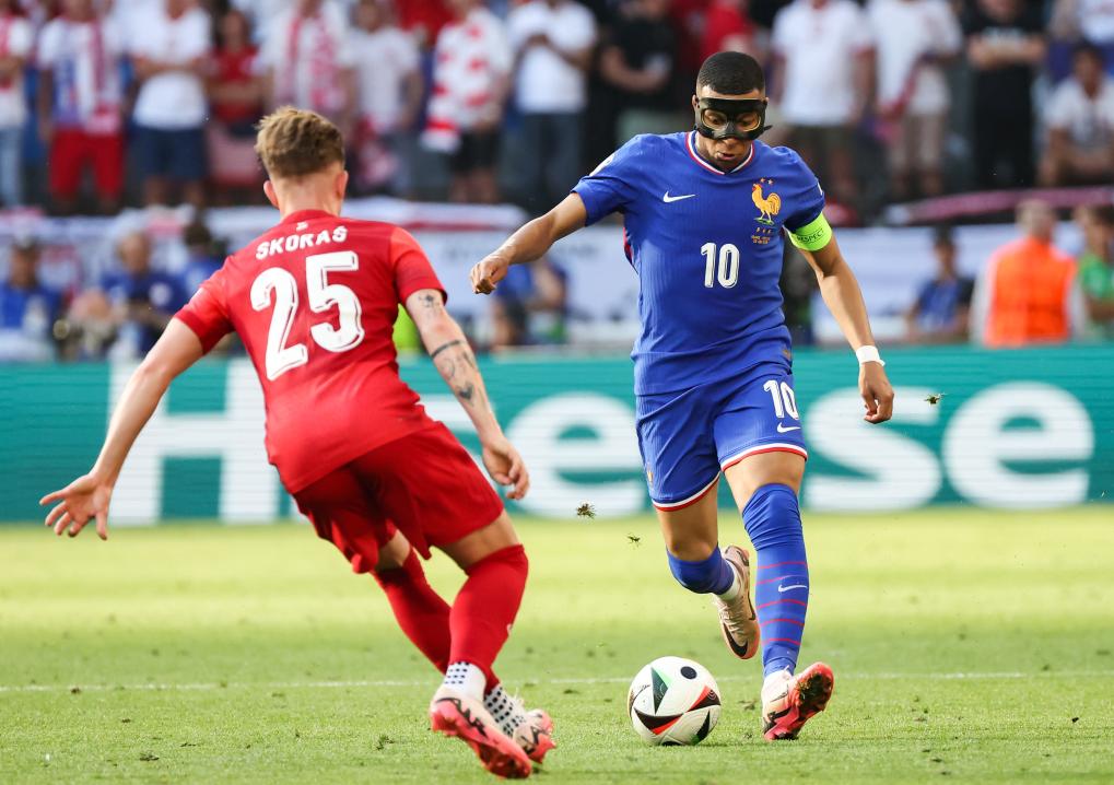 6月25日,姆巴佩(右)在比赛中进攻。当日,在德国多特蒙德进行的2024欧洲足球锦标赛D组第三轮比赛中,法国队1比1战平波兰队。新华社记者 张帆 摄