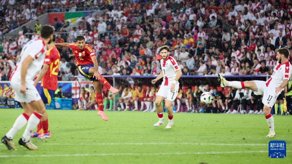 6月30日,西班牙队球员罗德里(左三)在比赛中破门得分。新华社记者 孟鼎博 摄