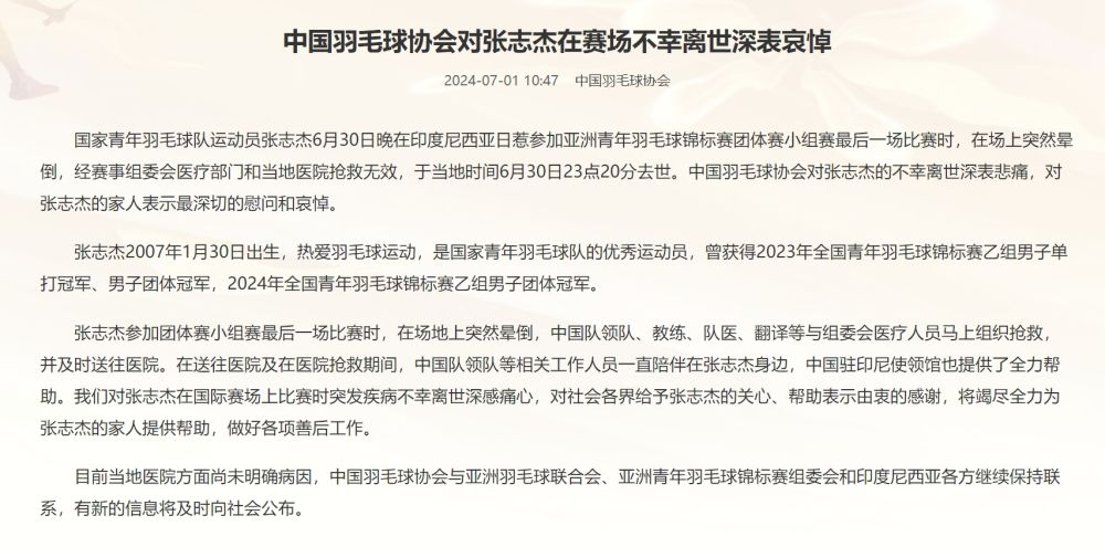 国家青年羽毛球队运动员张志杰6月30日在印度尼西亚日惹参加亚洲青年羽毛球锦标赛团体赛小组赛最后一场比赛时,在场上突然晕倒,抢救无效去世。中国羽毛球协会7月1日发布公告,对张志杰的不幸离世深表哀悼。