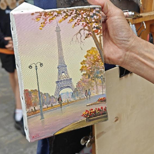 他摊位里的画不多,内容均是旁边的教堂以及埃菲尔铁塔,笔触精细,色调温暖。