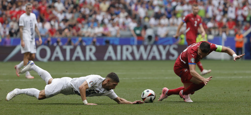 6月20日,斯洛文尼亚队球员格内兹达·塞林(左)和塞尔维亚队球员杜桑·塔迪奇拼抢。当日,在德国慕尼黑进行的2024年欧洲足球锦标赛小组赛C组第二轮比赛中,斯洛文尼亚队1比1战平塞尔维亚队。新华社发(菲利普·鲁伊兹摄)