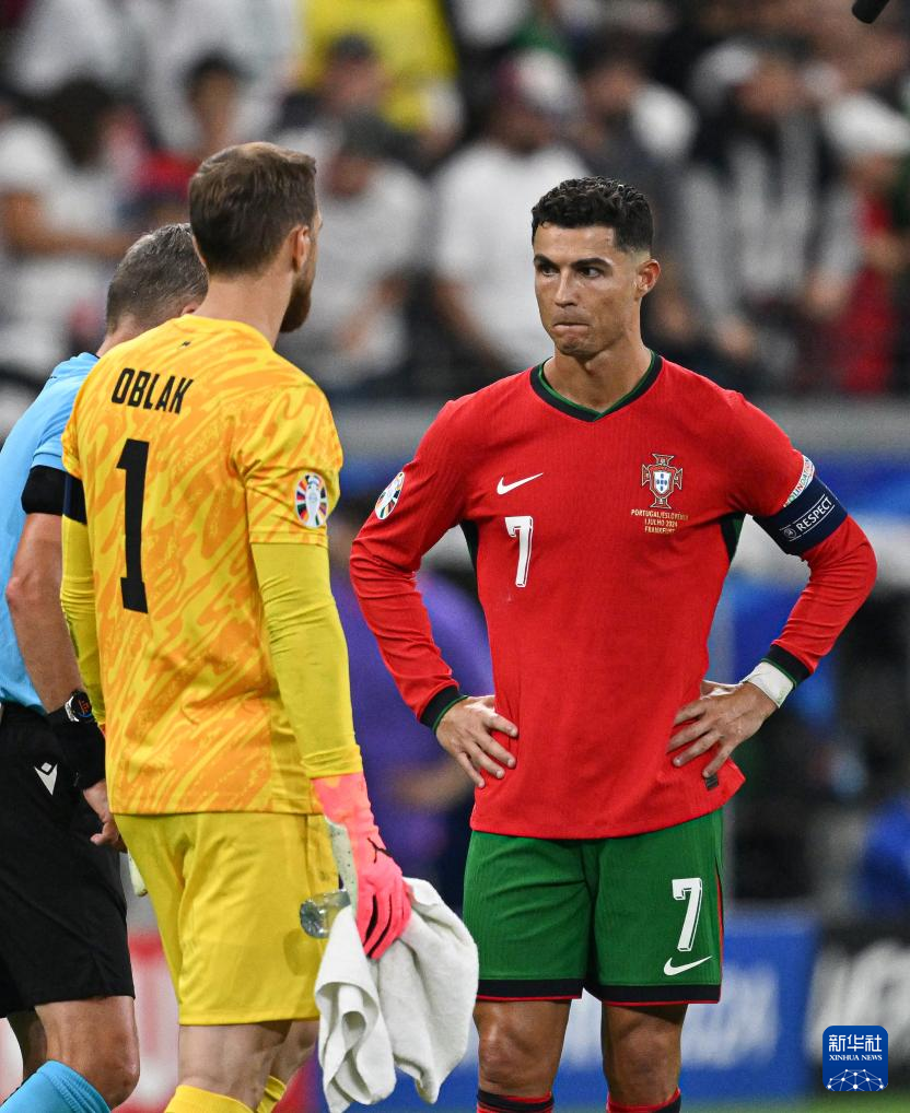 7月1日,葡萄牙队球员克·罗纳尔多(右)和斯洛文尼亚队守门员奥布拉克(中)在点球大战前。新华社记者 任鹏飞 摄