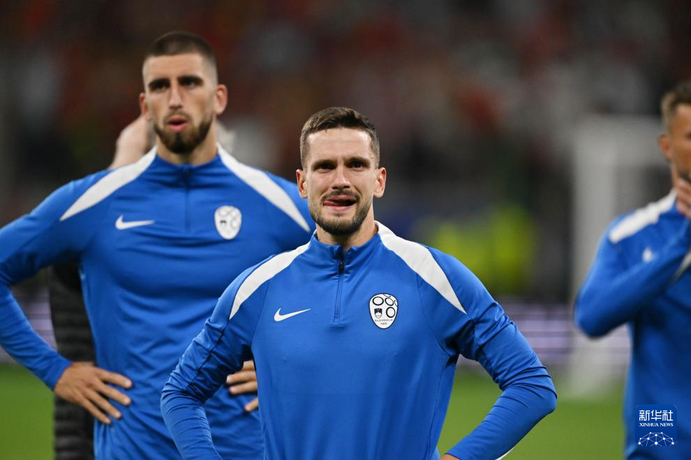 7月1日,斯洛文尼亚队球员斯托亚诺维奇(前)与队友在比赛后。新华社记者 任鹏飞 摄