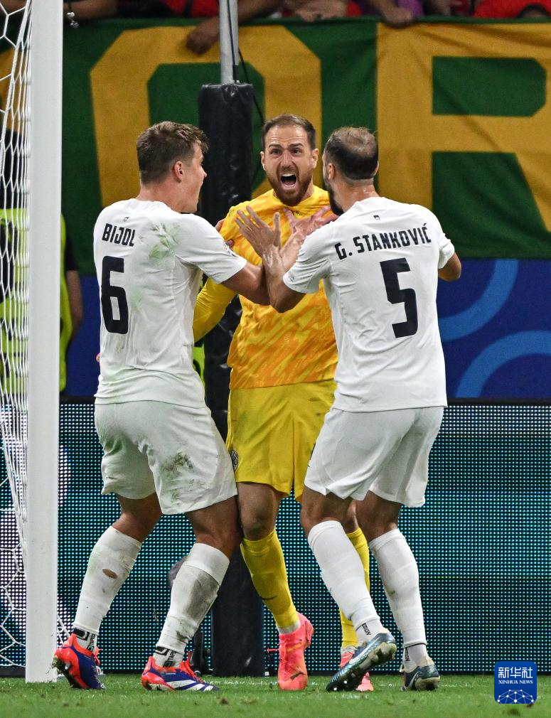 7月1日,斯洛文尼亚队守门员奥布拉克(中)在比赛中扑出葡萄牙队球员克·罗纳尔多主罚的点球后和队友庆祝。新华社记者 任鹏飞 摄