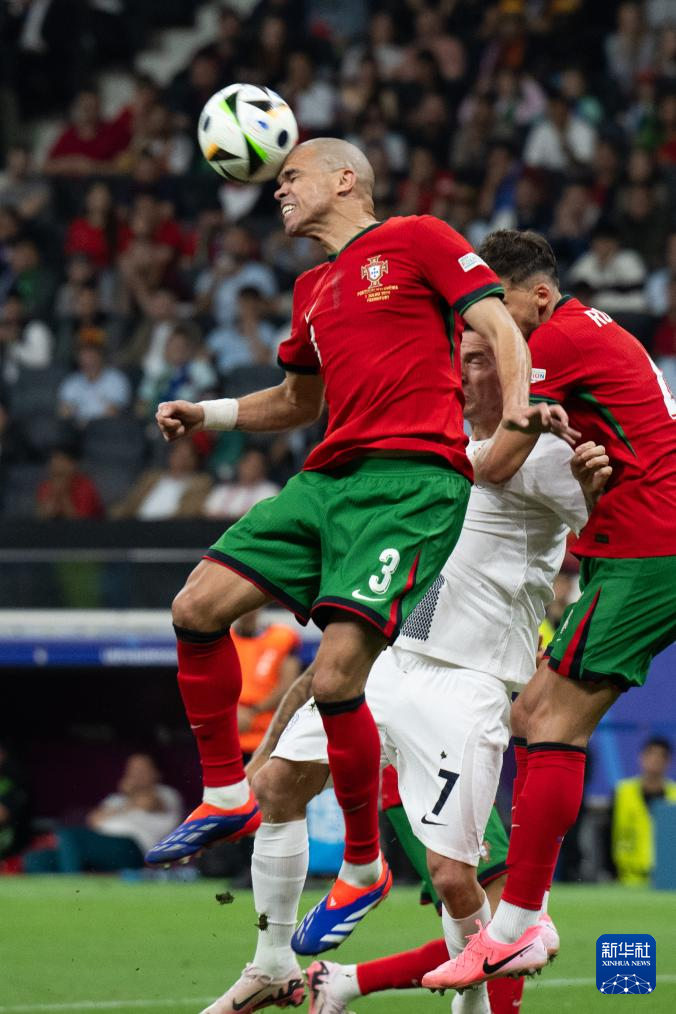 7月1日,葡萄牙队球员佩佩(左)在比赛中争顶。新华社记者 肖艺九 摄