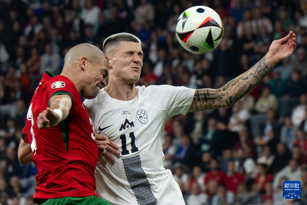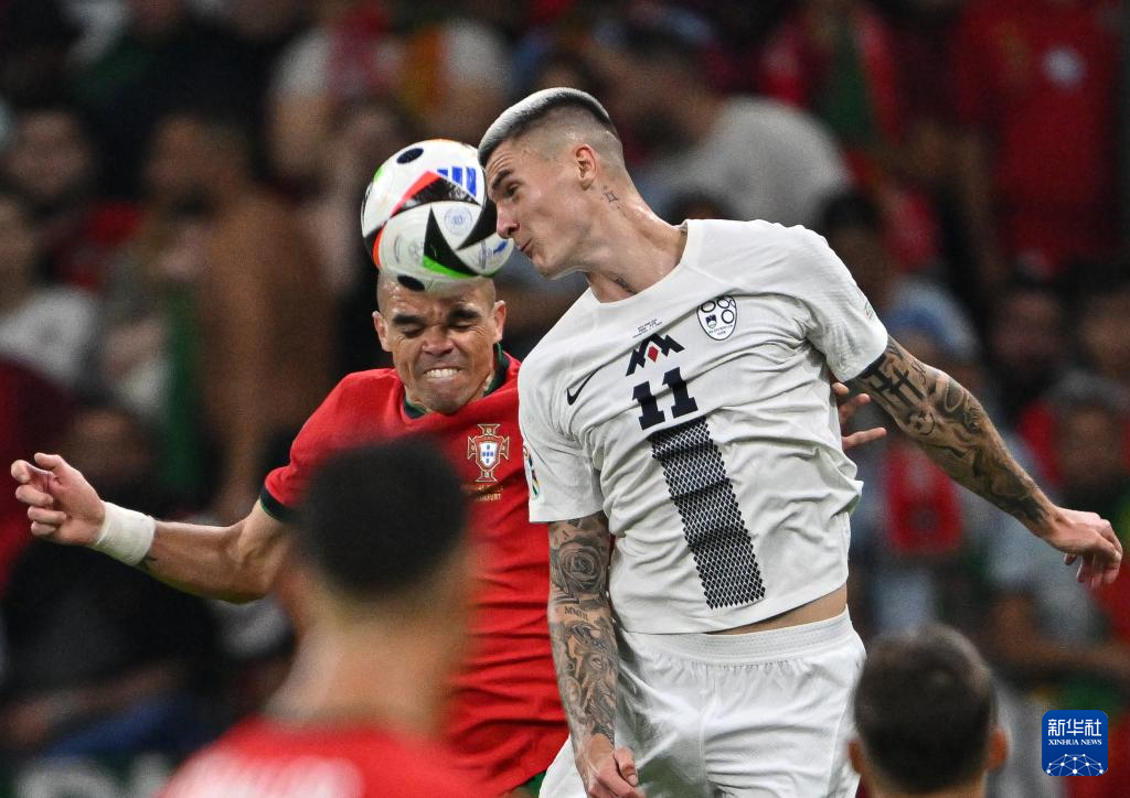 7月1日,葡萄牙队球员佩佩(左)和斯洛文尼亚队球员本杰明·塞斯科在比赛中争顶头球。新华社记者 任鹏飞 摄