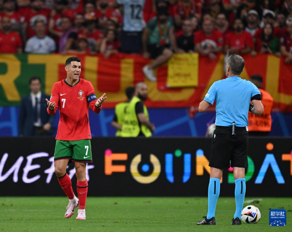 7月1日,葡萄牙队球员克·罗纳尔多(左)在比赛中和主裁判交流。新华社记者 任鹏飞 摄