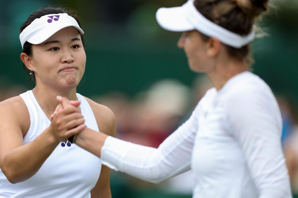 7月1日,朱琳(左)在赛后与贝古握手致意。当日,在英国伦敦举行的2024温布尔登网球公开赛女子单打首轮比赛中,中国选手朱琳2比0战胜罗马尼亚选手贝古,晋级下一轮。