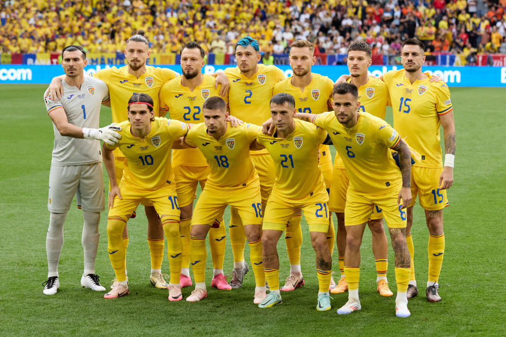 7月2日,罗马尼亚队首发球员在比赛前合影。新华社记者 孟鼎博 摄
