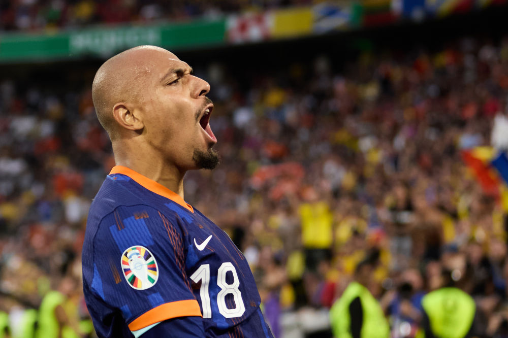 7月2日,荷兰队球员马伦在比赛中庆祝进球。新华社记者 孟鼎博 摄