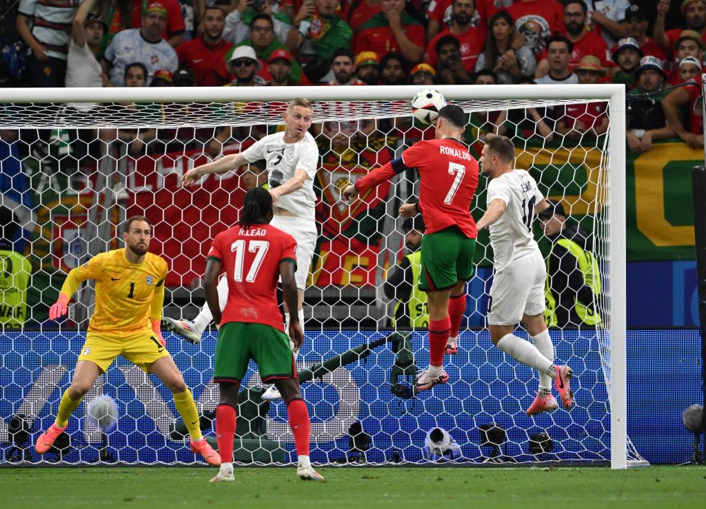 7月1日,葡萄牙队球员克·罗纳尔多(右二)在2024欧洲足球锦标赛八分之一决赛中争顶头球。新华社记者 任鹏飞 摄